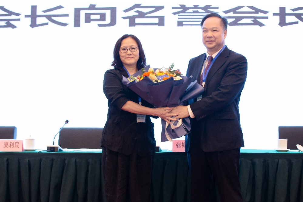 (新当选的会长张钢成向名誉会长夏利民献花)
